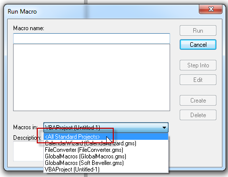 4. Sehingga muncul kotak dialog, pada Macros in pilih <All Standard Projects>